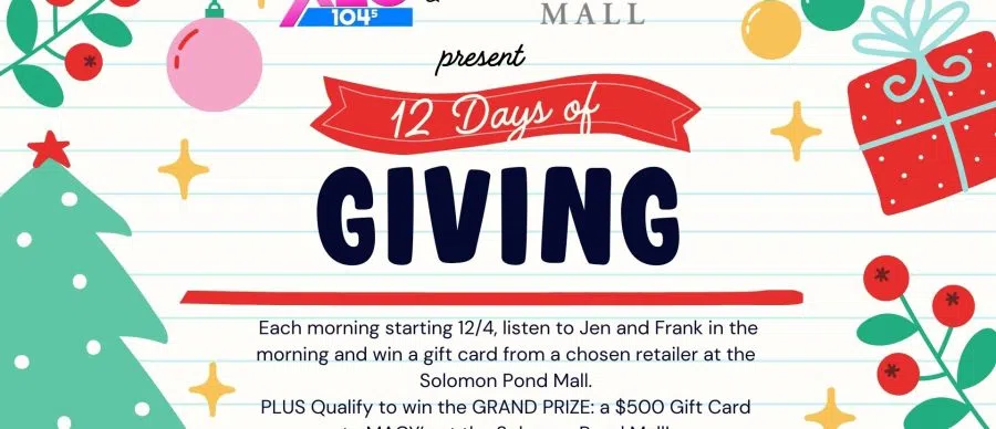 Keep it locked onto Jen and Frank in the Morning EACH day, for 12 days straight, to win a gift card from a chosen retailer at the Solomon Pond Mall. EVERYONE who wins, AUTOMATICALLY qualifies to win the GRAND PRIZE: a $500 Gift Card to MACY's at the Solomon Pond Mall!