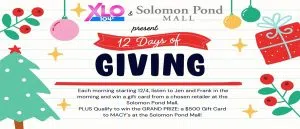 Keep it locked onto Jen and Frank in the Morning EACH day, for 12 days straight, to win a gift card from a chosen retailer at the Solomon Pond Mall. EVERYONE who wins, AUTOMATICALLY qualifies to win the GRAND PRIZE: a $500 Gift Card to MACY's at the Solomon Pond Mall!